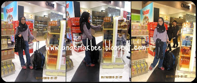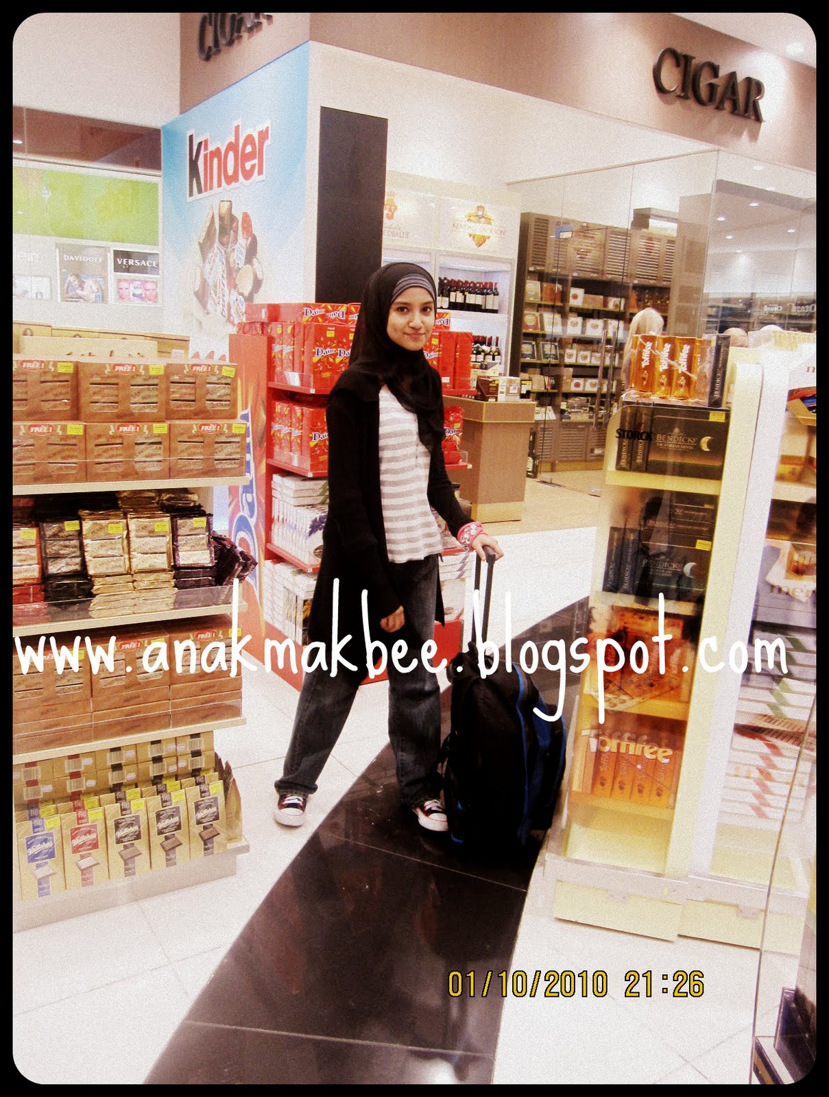 Ouh,and that's me. Fyi, this is just an action-terlebih session. Kita orang tak beli coklat pun. Masuk kedai-ukur keluasan kedai-ambik coklat-beratur kat cashier-tak jadi beli-keluar kedai. Haha :D It's normal okay in our family. We used to say 'nak itu, nak ini' and at last kita orang keluar dengan sedih-bangganya. ( sedih sebab tak dapat beli ape ape, bangga sebab kamilah satu-satunya orang yang dah masuk dan pusingpusing tapi tak jadik beli ape ape ). Well, actually takdela sedih mane pun. I'm not a chocolate-addict. Btw, coklat kat airport sumpah mahal. So my mummydaddy shouldn't be blamed la kan :)